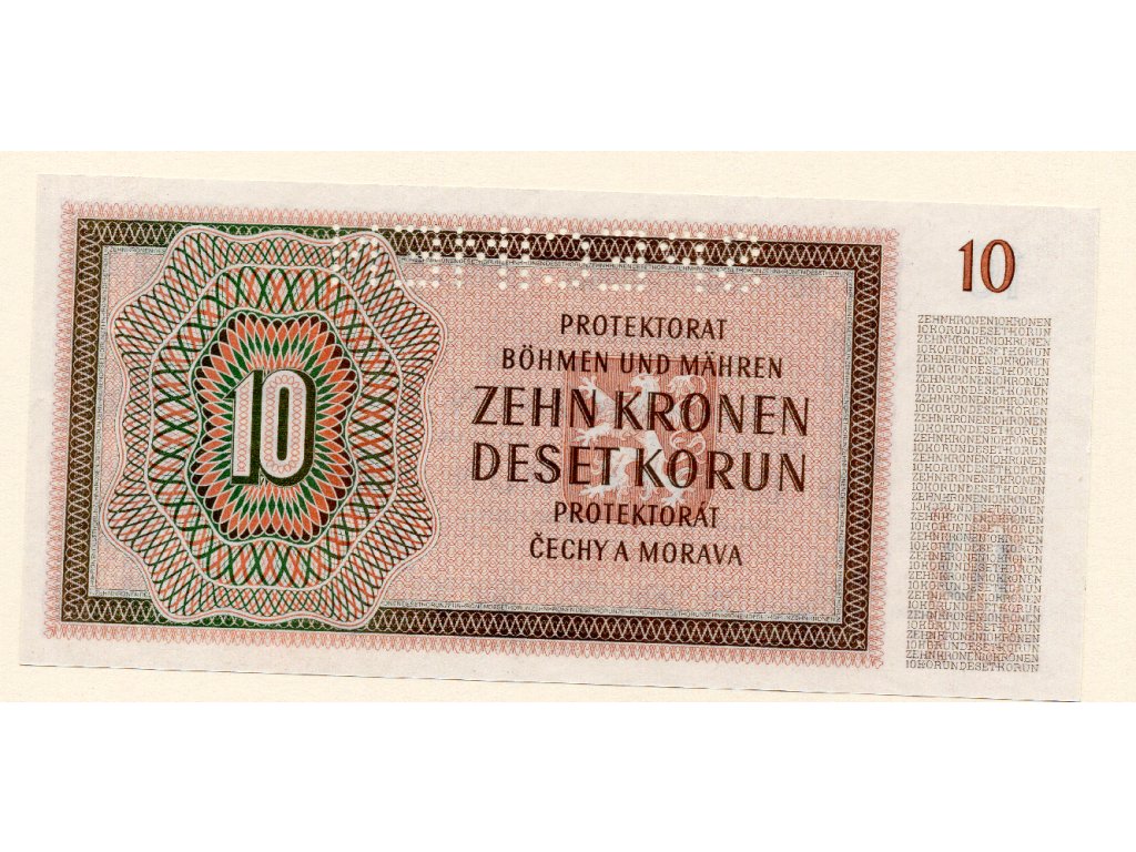 Tato bankovka o nominální hodnotě 10 Korun byla vydána v roce 1942 během nacistické okupace Československa, kdy území Čech a Moravy bylo prohlášeno za Protektorát. Bankovka nese označení „SPECIMEN“, což znamená, že sloužila jako vzor pro testovací nebo prezentační účely a nebyla určena pro běžný oběh. Perforace „SPECIMEN“ je jasně viditelná a potvrzuje její speciální status.