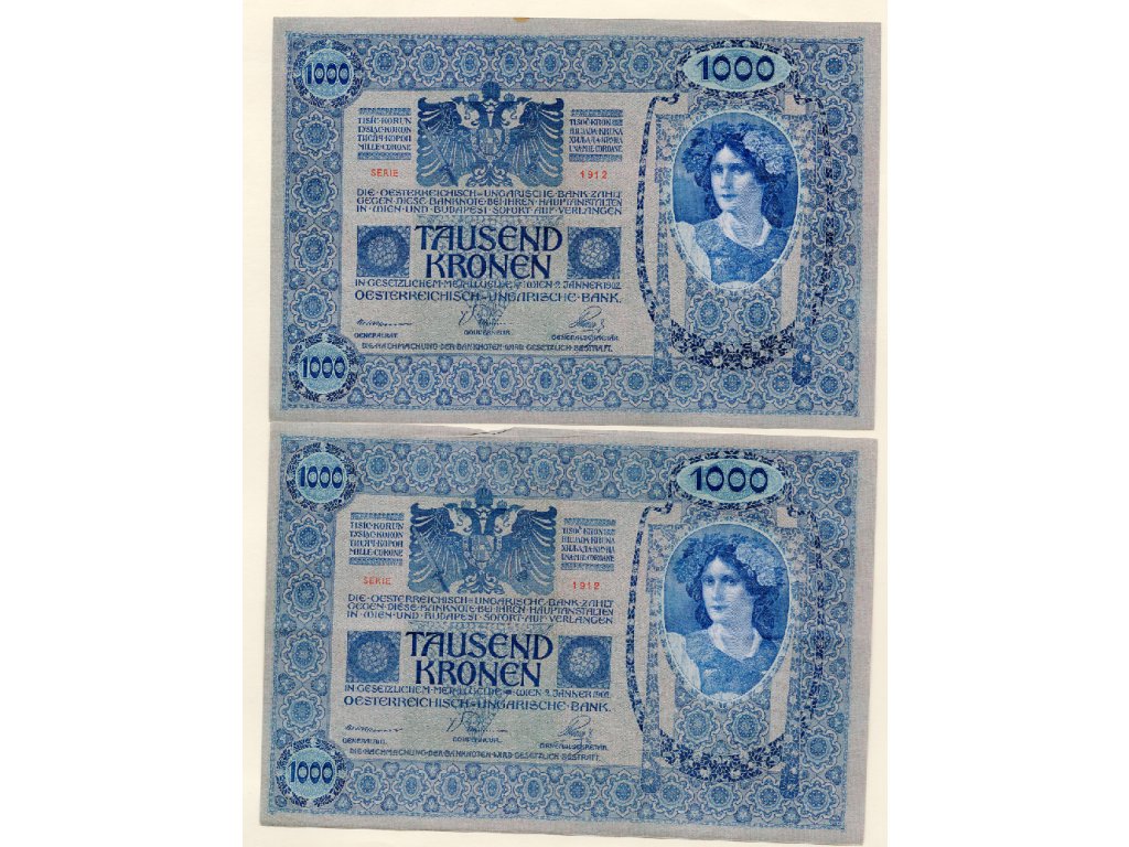 Bankovka o nominální hodnotě 1000 korun byla původně vydána Rakousko-Uherskou bankou 2. ledna 1902. Její mimořádně propracovaný výtvarný design reprezentuje secesní umění a kulturní estetiku monarchie na vrcholu jejího rozmachu. Averz zdobí portrét mladé ženy s květinovým věncem – alegorický motiv krásy a naděje – zasazený do detailně ornamentálního rámce. Nápisy jsou uvedeny v několika jazycích tehdejší mnohonárodní monarchie.
