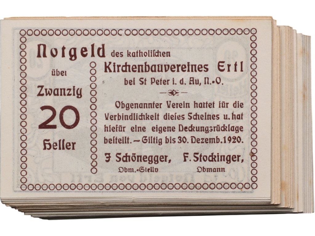 Rakousko se po skončení první světové války potýkalo s vážnými hospodářskými problémy, které vedly k nedostatku oběživa. V reakci na tuto situaci začaly vznikat nouzové poukázky známé jako Notgeld, vydávané nejen obcemi, ale i různými spolky a institucemi. Tato konkrétní emise pochází z Erlu u St. Peter in der Au a je spojena s katolickým stavebním spolkem, což odráží význam církevních organizací v místním životě.