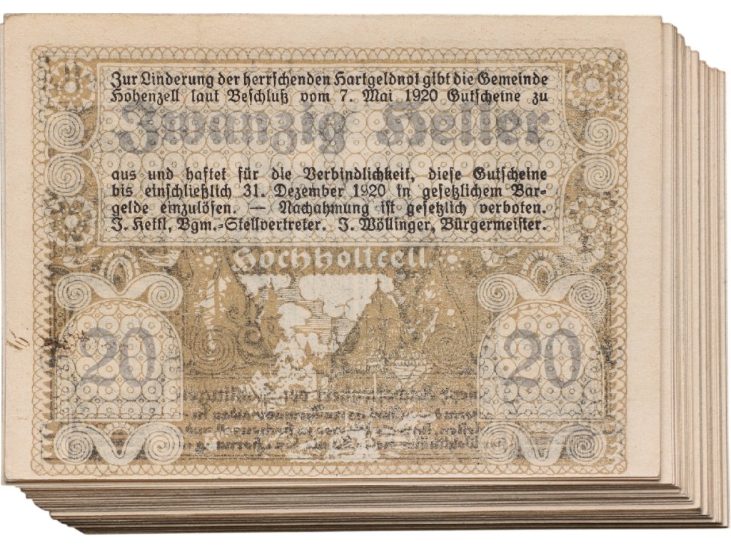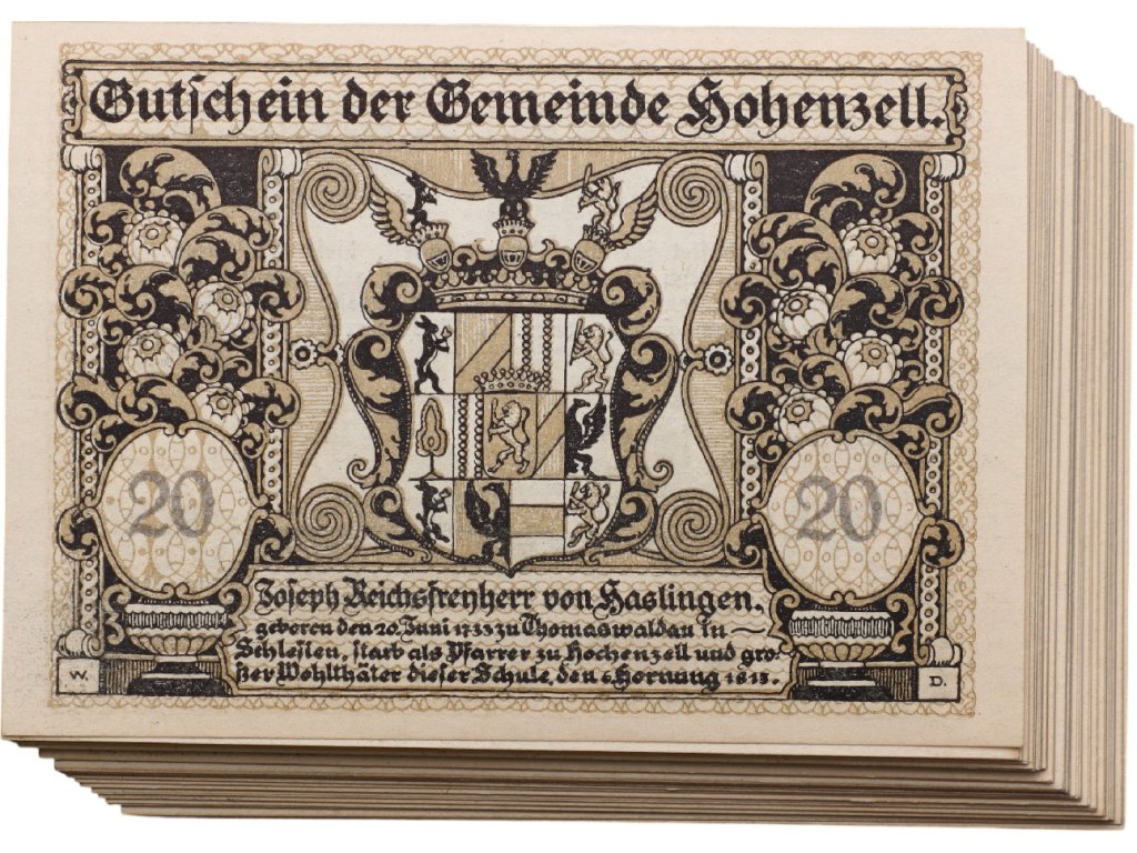 Jedním z takových příkladů je emise obce Hohenzell v Horním Rakousku z roku 1920. Nominální hodnota 20 hellerů patřila mezi drobné částky používané při každodenních nákupech. Lícní strana poukázky je zdobena dekorativním erbovým motivem doplněným ornamentální výzdobou, která byla pro mnohé lokální emise typická.