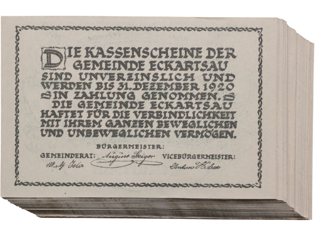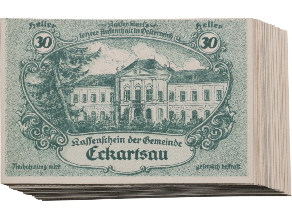 Rakousko procházelo po roce 1918 zásadní hospodářskou krizí, která vedla k nedostatku oběživa, zejména drobných nominálů. V této situaci začaly obce vydávat vlastní nouzová platidla, známá jako Notgeld. Eckartsau, obec spojená s významným historickým zázemím Dolního Rakouska, patřila mezi místa, kde tato praxe pomáhala udržet každodenní platební styk.