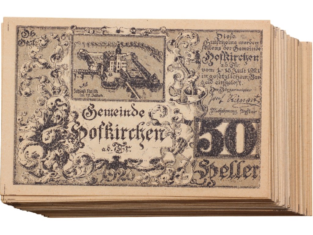 Rakousko se po rozpadu habsburské monarchie ocitlo v hluboké hospodářské krizi, která zasáhla každodenní fungování společnosti. Nedostatek oběživa, zejména drobných mincí, vedl k tomu, že řada měst a obcí začala vydávat vlastní nouzová platidla známá jako Notgeld. Hofkirchen an der Trattnach patří mezi místa, kde tato praxe pomáhala překlenout složité období let bezprostředně po roce 1918.