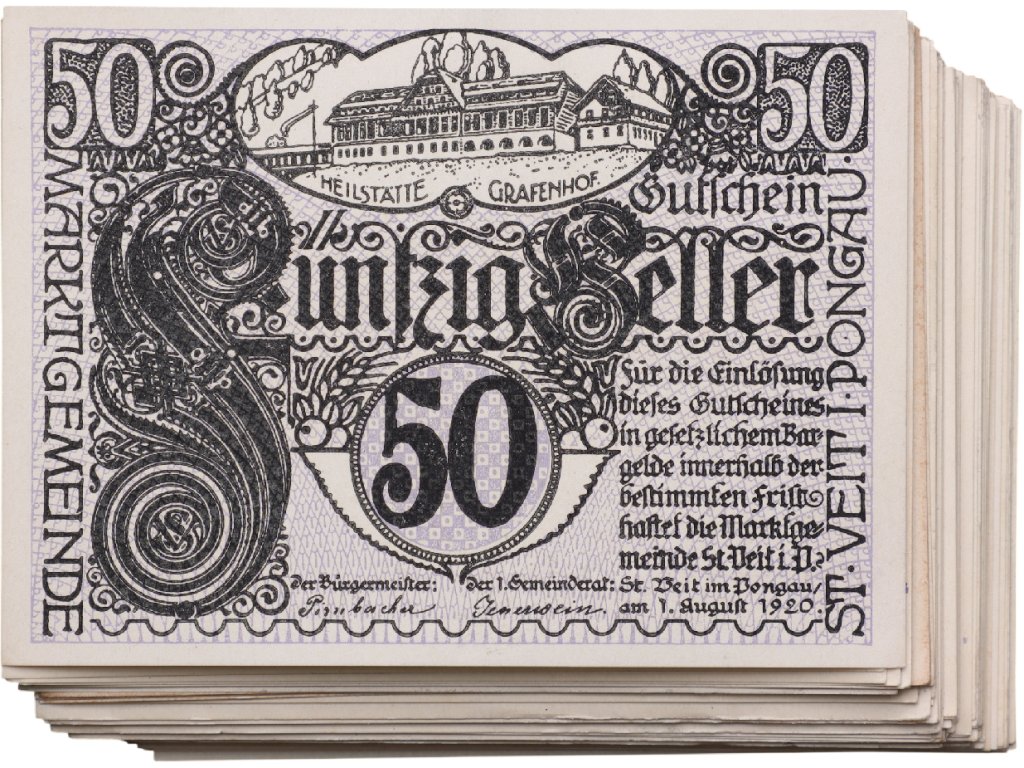 Rakousko po roce 1918 čelilo zásadním ekonomickým obtížím, které vedly k nedostatku drobných mincí. V reakci na tuto situaci vznikala nouzová platidla známá jako Notgeld, vydávaná obcemi i menšími regionálními celky. Jedním z těchto míst bylo i město St. Veit im Pongau v Salcbursku.
