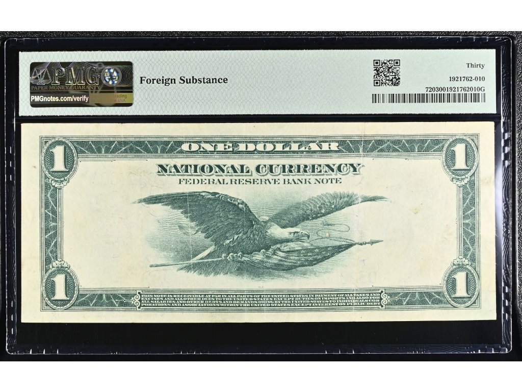 Bankovka je zapouzdřena a certifikována společností PMG (Paper Money Guaranty) s hodnocením 30 – Very Fine. Tento stupeň značí bankovku s patrným oběhem, obvykle s několika přehyby, ale stále s dobrým celkovým vzhledem a zachovalými detaily tisku.