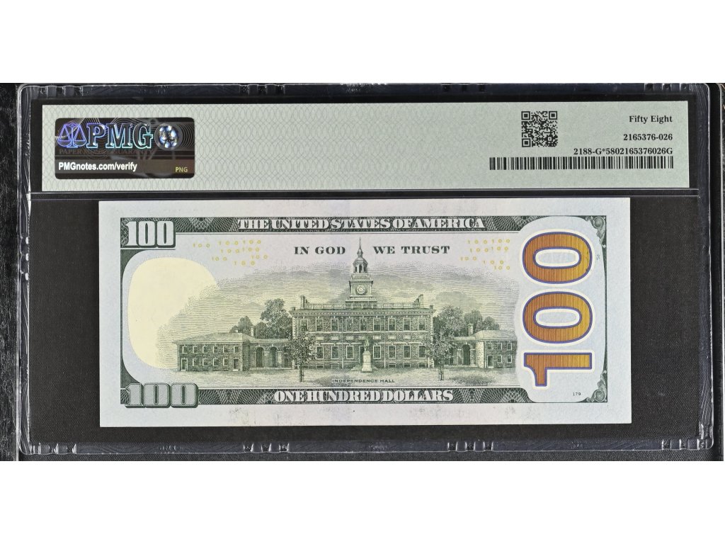 Bankovka je zapouzdřena a certifikována společností PMG (Paper Money Guaranty) s hodnocením 58 – Choice About Uncirculated, což značí téměř neobíhaný stav s velmi drobnými známkami manipulace.