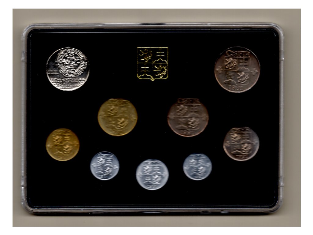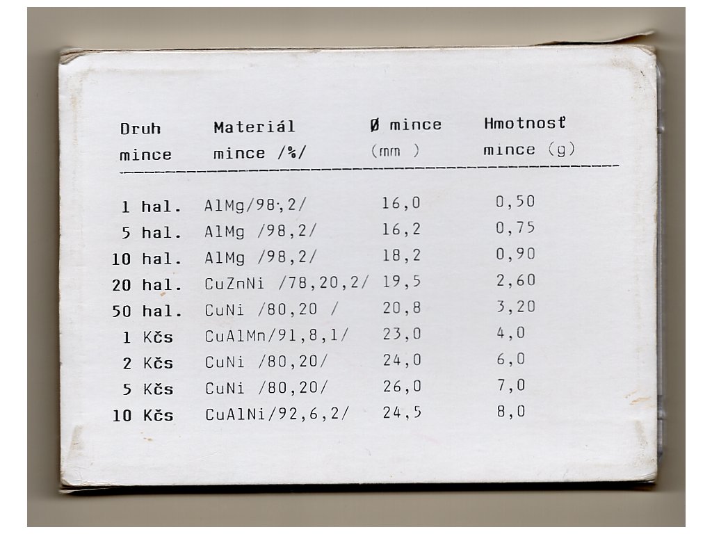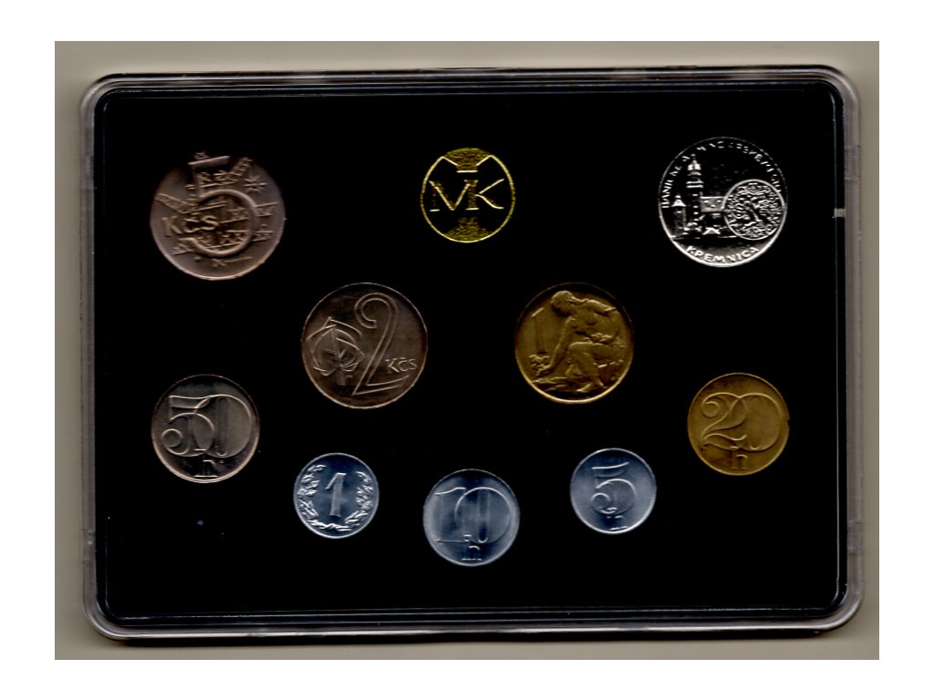 Rok 1991 představoval pro Československo přechodové období, kdy se měnový systém i podoba oběživa naposledy sjednocovala pro oba národní celky federace. Mincovna Kremnica tehdy razila nejen oběžné mince, ale i reprezentativní sady pro sběratele. Tento soubor obsahuje všechny tehdy platné nominály: 1, 5, 10, 20 a 50 haléřů, dále 1, 2 a 5 Kčs. Místo původní desetikorunové mince je zde však vložen mosazný žeton Mincovny Kremnica s emblémem MK, který je typický pro část sad z konce výroby v roce 1991.