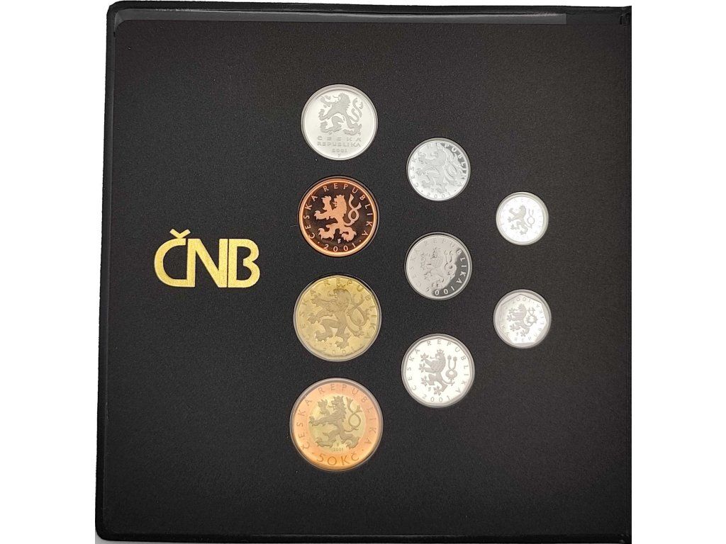 Tato reprezentativní sada oběžných mincí České republiky z roku 2001 zachycuje kompletní nominální řadu platidel včetně dnes již neplatných haléřových hodnot – 10, 20 a 50 haléřů. Všechny mince jsou vyraženy v mimořádné kvalitě proof, která je charakteristická zrcadlovým leskem plochy a matovaným reliéfem. Tento kontrast vzniká náročným ručním procesem úpravy razidel a výsledkem je dokonalá prezentace české měny v nejvyšší sběratelské kvalitě.