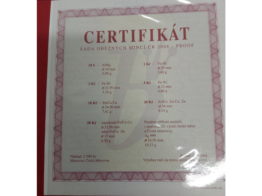 Sada oběžných mincí České republiky z roku 2008 v kvalitě proof je určena pro náročné sběratele, kteří oceňují nejen precizní zpracování, ale i tematickou hodnotu. Obsahuje všech sedm platných mincí – od 50 haléřů po 50 Kč – s letopočtem 2008, vyražených ve špičkové kvalitě se zrcadlovým polem a matným reliéfem. Mince jsou chráněny plastovými kapslemi a uloženy ve stylovém červeném balení s logy ČNB a České mincovny.