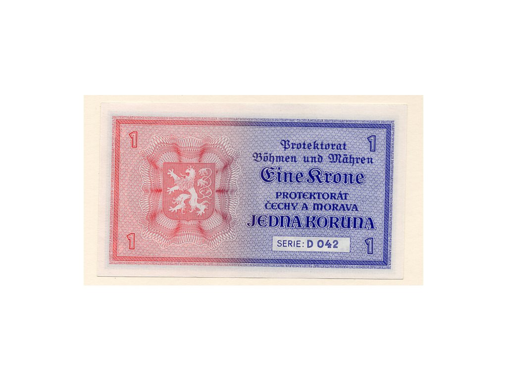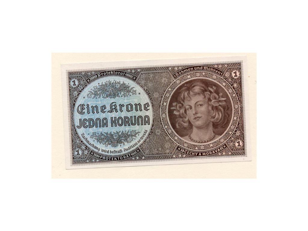 Tato bankovka o nominální hodnotě 1 koruna byla vydána během německé okupace Čech a Moravy a nese označení Protektorát Böhmen und Mähren – Čechy a Morava. Emise pochází z roku 1940 (bez datace) a má katalogové číslo Pick# 3a. Vizuálně atraktivní lícní stranu zdobí portrét mladé ženy s květinovou ozdobou ve vlasech a bohatě ornamentální rámeček s nápisy v češtině i němčině. Rubová strana obsahuje dominantní státní znak se lvem a nápisy „Jedna koruna / Eine Krone“ v červenofialové a modré barvě.