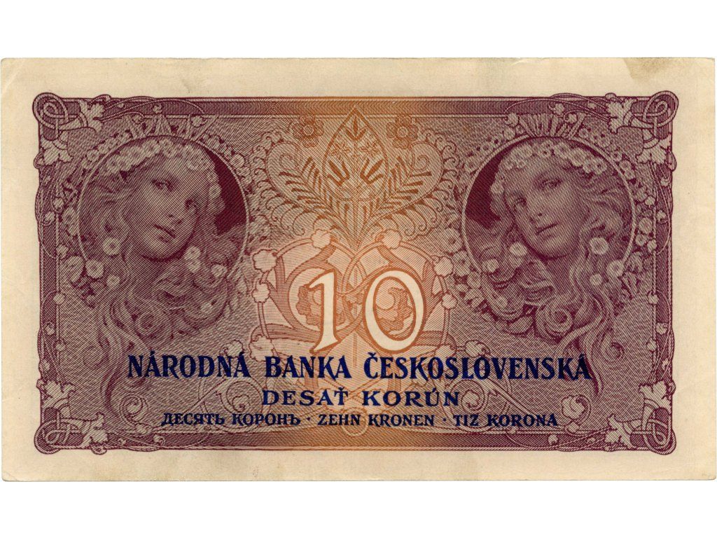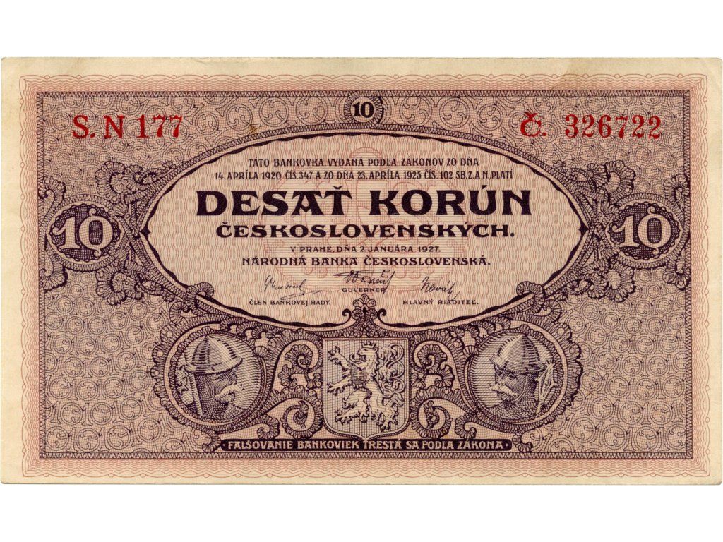Desetikorunová bankovka z roku 1927, vydaná Národní bankou Československou, patří mezi typické zástupce měnové estetiky První republiky. Na lícní straně se nachází složitě vyvedený rámec s nápisem v češtině a slovenštině, státním znakem a motivy horníků a rolníků. Rub zdobí stylizované ženské hlavy v secesním duchu, doplněné vícejazyčným označením hodnoty (česky, rusky, německy, maďarsky).