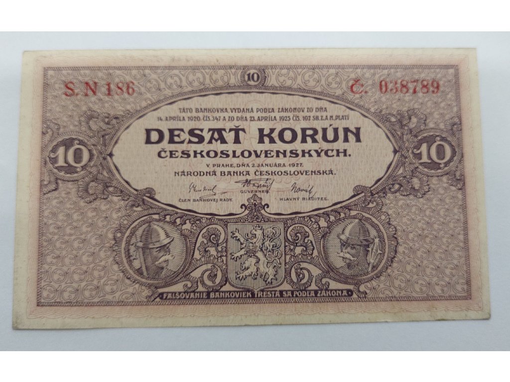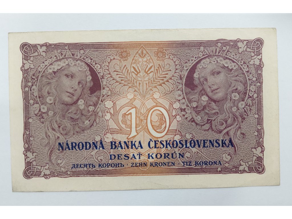Desetikorunová bankovka z roku 1927, vydaná Národní bankou Československou, patří mezi typické zástupce měnové estetiky První republiky. Na lícní straně se nachází složitě vyvedený rámec s nápisem v češtině a slovenštině, státním znakem a motivy horníků a rolníků. Rub zdobí stylizované ženské hlavy v secesním duchu, doplněné vícejazyčným označením hodnoty (česky, rusky, německy, maďarsky).