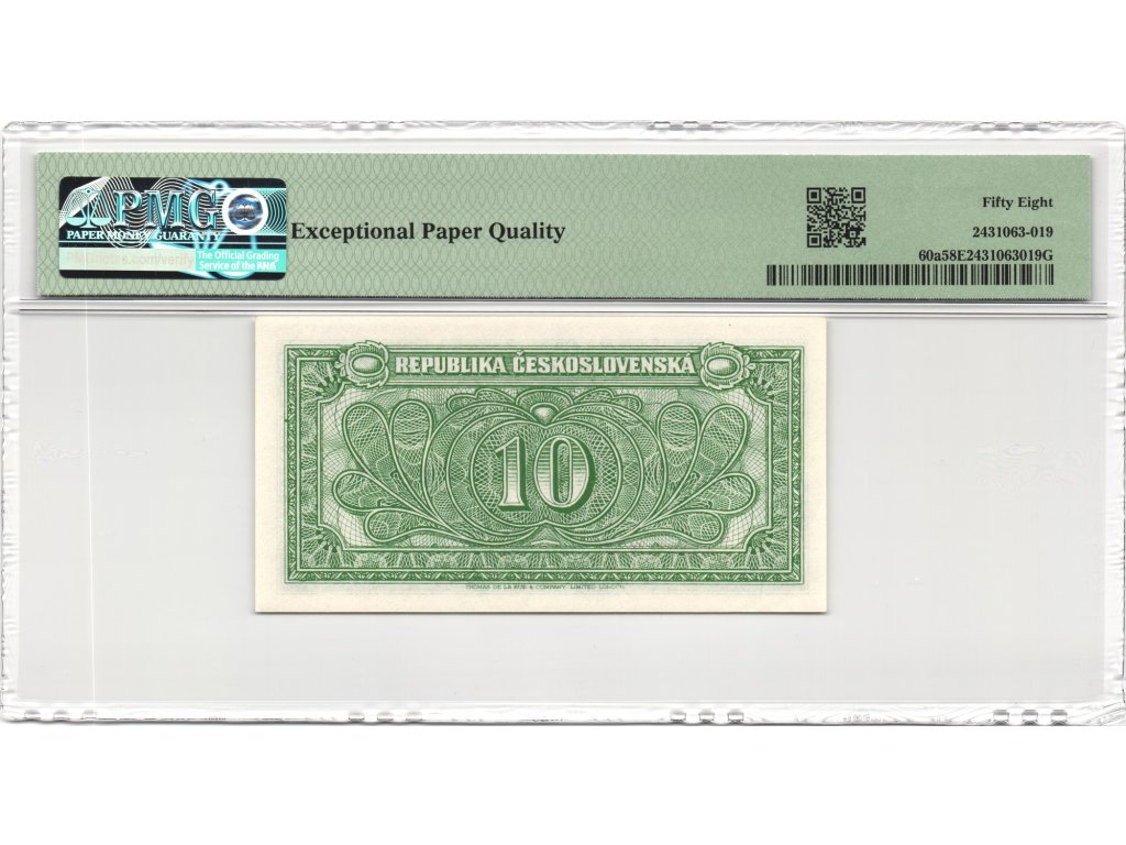 Stupeň zachování PMG 58 EPQ (Choice About Uncirculated) potvrzuje výjimečně dobrou kvalitu tohoto kusu, s neporušenou strukturou papíru a pouze minimálními stopami manipulace. Certifikace PMG navíc zaručuje jeho autenticitu a původní, nečištěný stav (Exceptional Paper Quality), což významně zvyšuje jeho důvěryhodnost na sběratelském trhu.