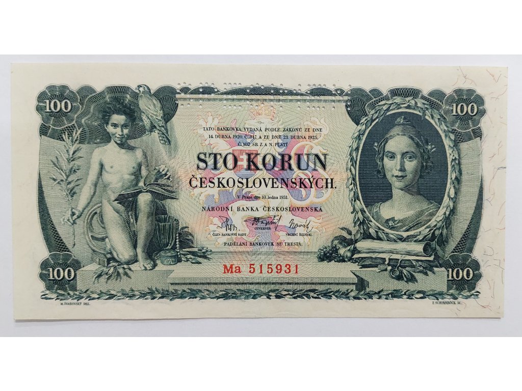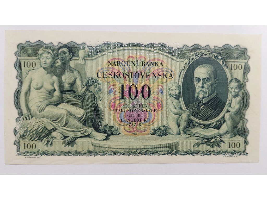 Elegantní československá bankovka 100 Korun z roku 1931 ve variantě „Specimen“ s perforací. Umělecký návrh Maxe Švabinského, vysoká sběratelská hodnota a historický význam.