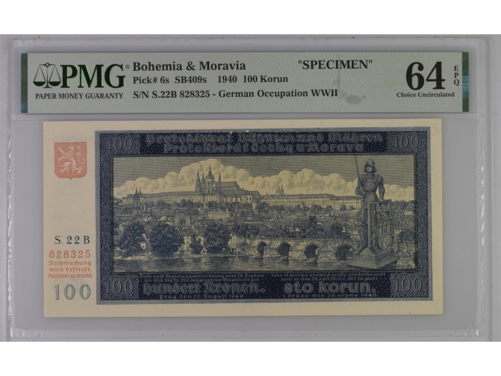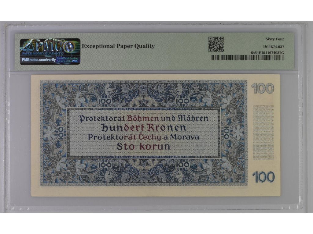Díky kombinaci vysoké zachovalosti, specimen provedení a historického kontextu okupace představuje tato 100korunová bankovka mimořádně atraktivní přírůstek do sbírek papírových platidel. Certifikace PMG zvyšuje důvěryhodnost, investiční hodnotu i budoucí likviditu na trhu.