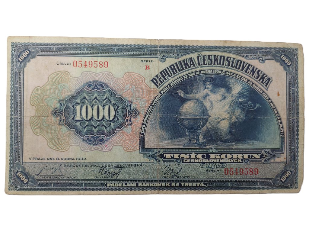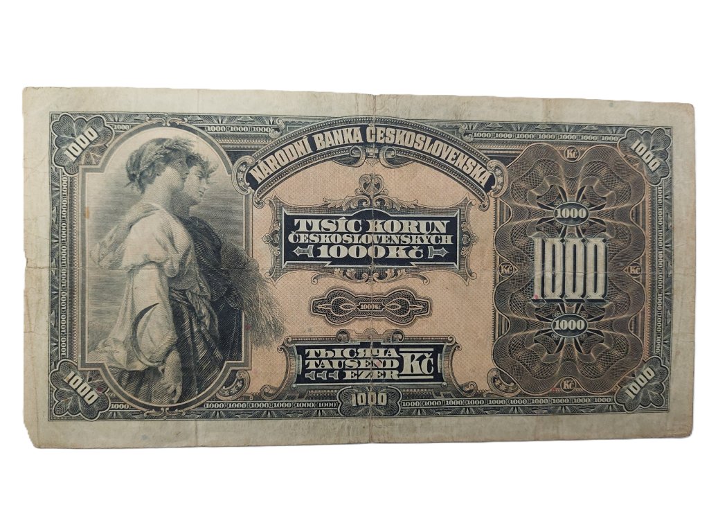 Bankovka v hodnotě 1000 korun z roku 1932, vydaná Národní bankou Československou, patří mezi nejimpozantnější oběžné papírové peníze první republiky. V době svého vydání představovala značnou kupní sílu, což ji činí atraktivním sběratelským kouskem i dnes. Na lícové straně dominuje alegorická postava ženy se snopem obilí a glóbem, ztvárňující motiv práce a prosperity. Rubová strana nese portrét ženy v klasickém římském rouchu, lemovanou bohatě zdobeným orámováním.