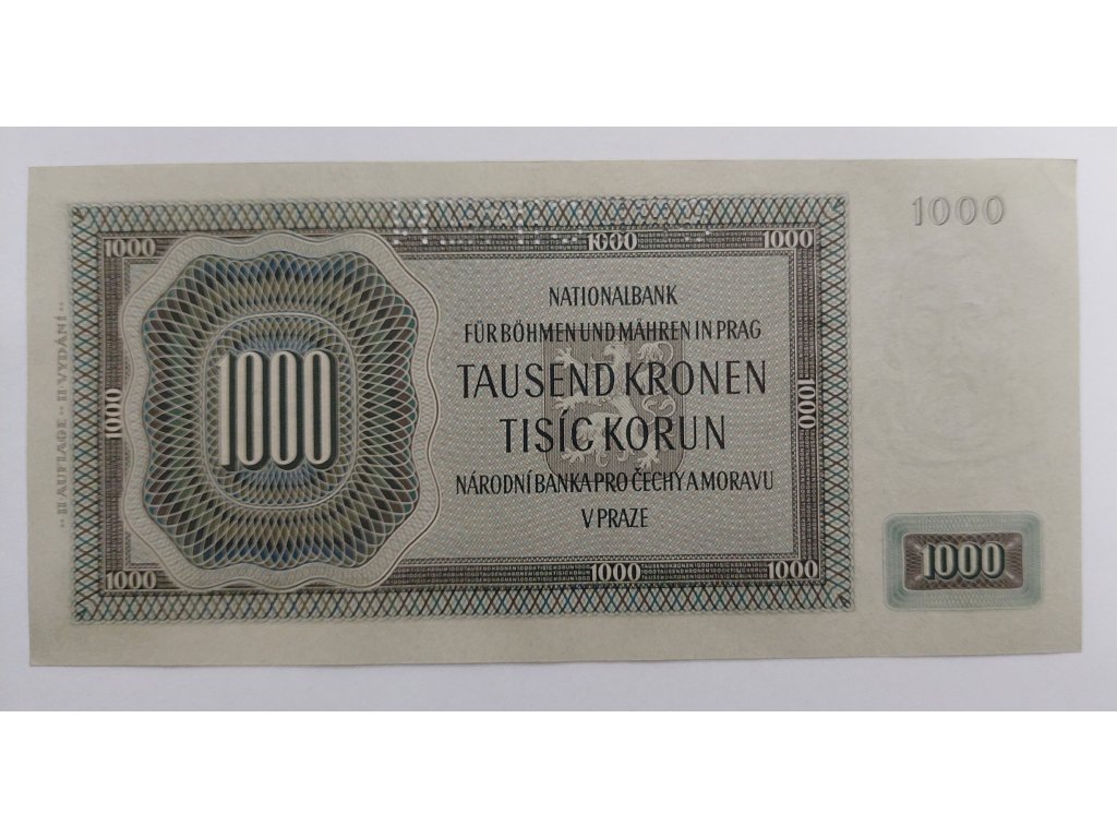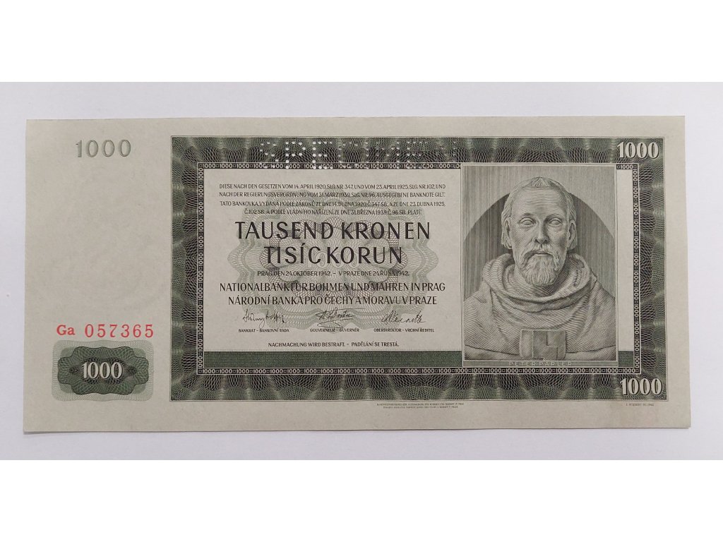 Tato bankovka byla vydána v roce 1942 Národní bankou pro Čechy a Moravu v Praze, v době nacistické okupace, kdy Protektorát Čechy a Morava fungoval jako autonomní správní jednotka pod německou kontrolou. Na lícové straně dominuje portrét Petra Parléře – významného stavitele katedrály sv. Víta, což je symbolický odkaz k české kulturní historii, a to i v době útlaku. Dvojjazyčné texty (němčina a čeština) odrážejí dobový politický kontext. Hodnota 1000 korun byla v té době vysoká a bankovka tak sloužila především pro větší transakce. Vytištěna byla na kvalitním papíře o rozměrech 202 × 96 mm. Série „Eb“ a červené sériové číslo jsou výrazné identifikační znaky. Bankovka je dnes demonetizována a její historická hodnota spočívá nejen v numismatickém významu, ale i jako svědectví o složité době. Katalogová reference Pick# 13.