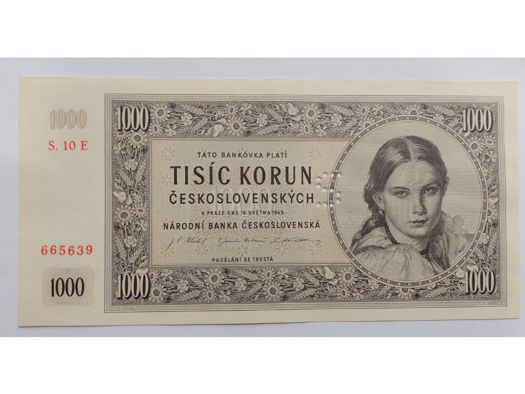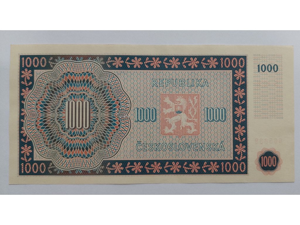 Tisícikoruna z roku 1945 byla vydána krátce po osvobození a náleží k významným emisím Třetí republiky (1945–1948). Na líci bankovky je vyobrazen portrét mladé ženy zasazený do bohatého květinového ornamentu, symbolizujícího znovuzrození a naději. Text „Tato bankovka platí tisíc korun československých“ připomíná návrat k národní měně po období okupace. Rubová strana nese státní znak se lvem a složitý geometrický a květinový motiv s hodnotovým označením 1000. Autory bankovky byli Bedřich Fojtášek (design) a Ladislav Jirka (rytina), jejichž jména se objevují v opisu. Bankovka byla tištěna na kvalitním papíru s ochrannými prvky, avšak v oběhu zůstala jen omezenou dobu. Dnes je demonetizovaná, avšak sběrateli je vyhledávána pro svůj historický význam i výtvarné zpracování.