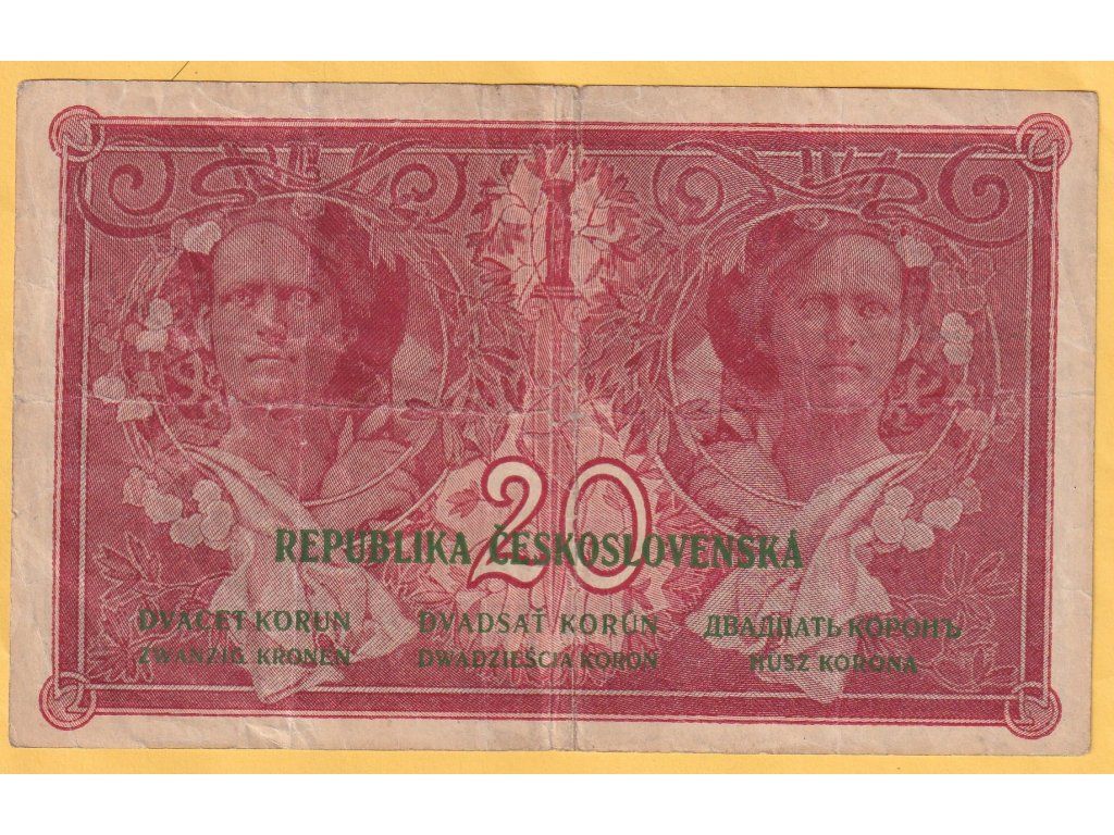 Tato státovka v nominální hodnotě 20 korun byla vydána dne 10. dubna 1919 jako součást první řady československých platidel po vzniku samostatného státu. Návrh vytvořil světoznámý secesní umělec Alfons Mucha, který v duchu národního obrození zachytil alegorické postavy ženy a muže obklopené rostlinnými motivy. Reverz bankovky je bohatě dekorovaný modrým rámem se stylizovanými motivy a texty v několika jazycích (slovenština, němčina, maďarština, ruština).