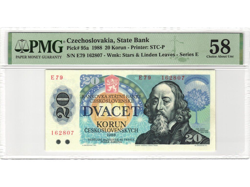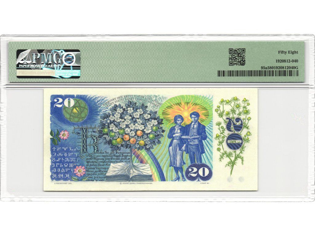 Bankovka je certifikována společností PMG (číslo E79 162807, hodnocení 58 – Choice About Uncirculated), což zajišťuje její pravost a vysokou sběratelskou hodnotu. Jde o vyhledávaný exemplář nejen pro milovníky československé historie, ale i pro sběratele papírových platidel s významnou kulturní symbolikou.