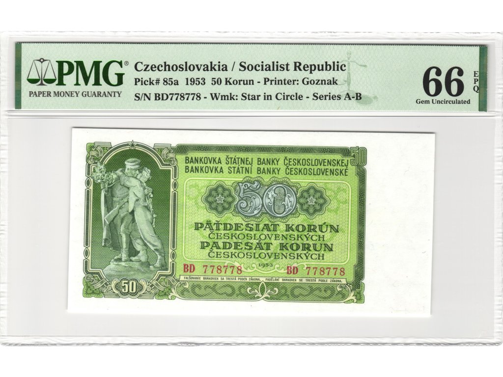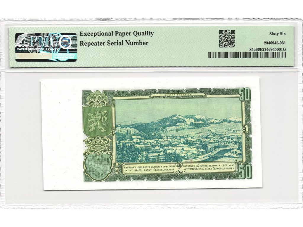Československá bankovka 50 Korun z roku 1953 v excelentní kvalitě PMG 66 EPQ. Výrazné barvy, motiv družby a panorama Banské Bystrice. Atraktivní kus pro sběratele socialistické éry.