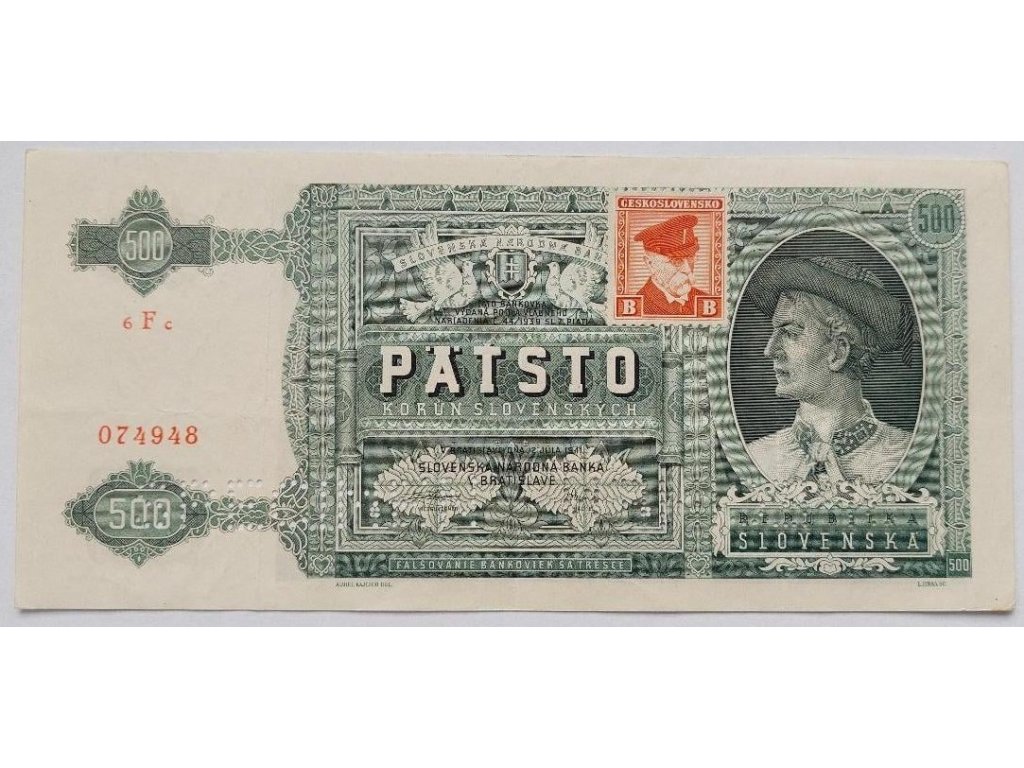 Tato bankovka původně vydaná v roce 1941 Slovenskou národní bankou nese dodatečný kolkovací kolek z období po roce 1945, kdy došlo k přechodnému řešení měnového oběhu po zániku Slovenského štátu a obnovení Československé republiky. Kolek „Československo B“ v pravém horním rohu signalizuje oficiální dodatečné schválení platnosti této bankovky v poválečném kontextu. V dolní části je navíc perforace 2× SPECIMEN, která značí, že se jedná o vzorový exemplář – nikoli oběhové platidlo, ale tiskový či archivní vzorek. Líc zdobí muž v kroji a slovenský státní znak, rub pak bohatě symbolizuje přírodní bohatství a tradice – včetně scenérie Tater, plodů a knihy. Tato bankovka spojuje důležité historické etapy a je ceněna nejen jako doklad měnové transformace, ale i pro svou estetickou kvalitu a sběratelskou vzácnost.