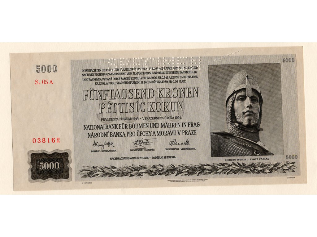 Bankovka o hodnotě 5000 korun, vydaná v roce 1944 Národní bankou pro Čechy a Moravu v Praze, vznikla během pozdní fáze nacistické okupace. Její výraznou dominantou je portrét svatého Václava ve zbroji, který slouží jako silný symbol české státnosti, víry a historické identity – i v době podřízenosti německé moci. Na bankovce jsou použity dvojjazyčné nápisy v češtině a němčině, jak bylo tehdy obvyklé. Tisková kvalita, ornamentika a styl gravury ukazují důraz na ochranu proti padělání. Bankovka má rozměry 190 × 90 mm a je vytištěna na papíru. Červené sériové číslo a perforace „SPECIMEN“ značí, že jde o vzorový tisk, ne určený pro běžný oběh. Jako platidlo je dnes demonetizována, avšak pro sběratele a historiky zůstává velmi hodnotným dokumentem protektorátní éry. Katalogové označení Pick# 17.