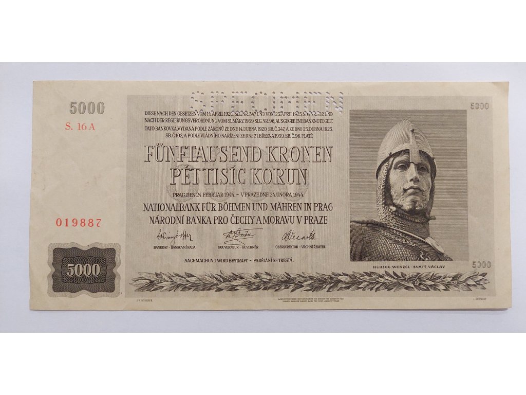 Bankovka o hodnotě 5000 korun, vydaná v roce 1944 Národní bankou pro Čechy a Moravu v Praze, vznikla během pozdní fáze nacistické okupace. Její výraznou dominantou je portrét svatého Václava ve zbroji, který slouží jako silný symbol české státnosti, víry a historické identity – i v době podřízenosti německé moci. Na bankovce jsou použity dvojjazyčné nápisy v češtině a němčině, jak bylo tehdy obvyklé. Tisková kvalita, ornamentika a styl gravury ukazují důraz na ochranu proti padělání. Bankovka má rozměry 190 × 90 mm a je vytištěna na papíru. Červené sériové číslo a perforace „SPECIMEN“ značí, že jde o vzorový tisk, ne určený pro běžný oběh. Jako platidlo je dnes demonetizována, avšak pro sběratele a historiky zůstává velmi hodnotným dokumentem protektorátní éry. Katalogové označení Pick# 17.