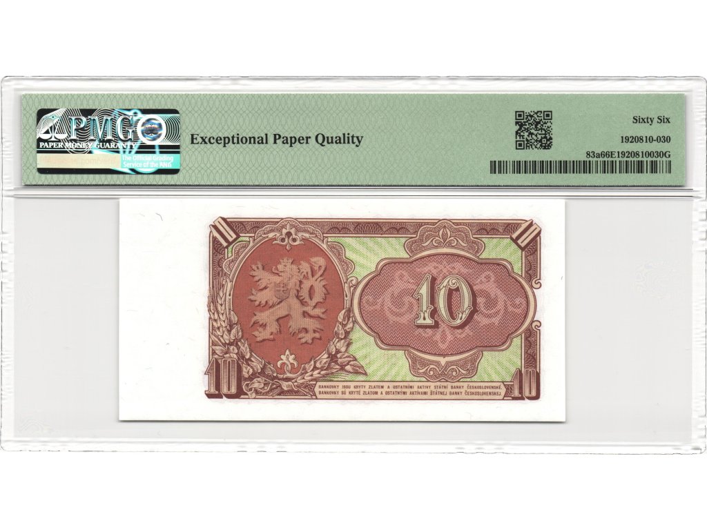 Bankovka je certifikována organizací PMG jako 66 EPQ (Gem Uncirculated – Exceptional Paper Quality). Vysoké hodnocení garantuje ostrý tisk, zachovalé rohy i původní povrch papíru bez chemických zásahů. Jedná se o sběratelsky atraktivní kus zejména v tomto stavu, který představuje výborný příklad dobového grafického stylu.