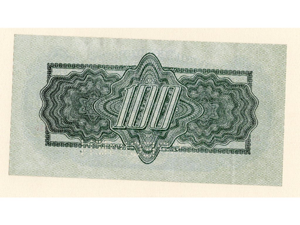 Stokorunová poukázka byla jedním z klíčových nominálů této nouzové emise. Její provedení odráží důraz na ochranné prvky a ztíženou padělatelnost v době, kdy byla stabilita měny pro domácí trh zásadní. Tento kus je navíc vybaven perforací SPECIMEN umístěnou v horní části, což svědčí o jeho funkci jako neplatného vzorového exempláře určeného pro archivní, kontrolní či školící účely.