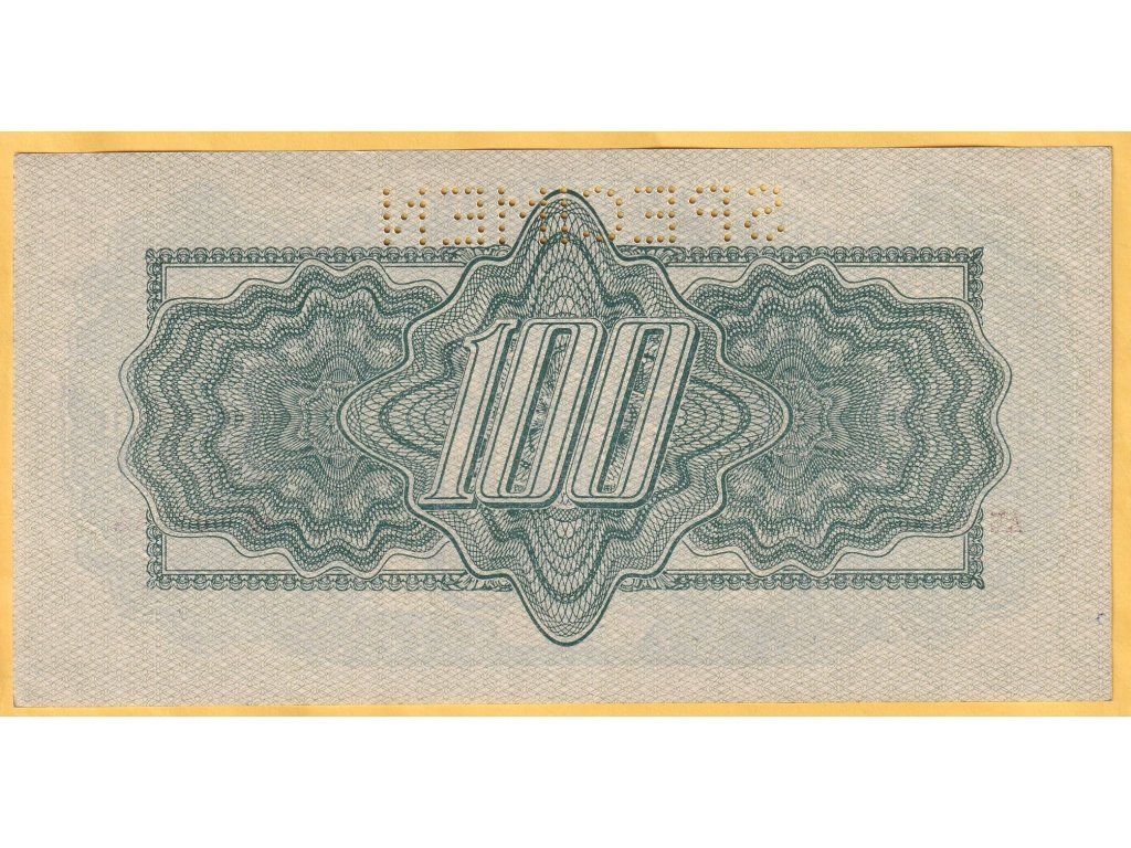Stokorunová poukázka byla jedním z klíčových nominálů této nouzové emise. Její provedení odráží důraz na ochranné prvky a ztíženou padělatelnost v době, kdy byla stabilita měny pro domácí trh zásadní. Tento kus je navíc vybaven perforací SPECIMEN umístěnou v horní části, což svědčí o jeho funkci jako neplatného vzorového exempláře určeného pro archivní, kontrolní či školící účely.