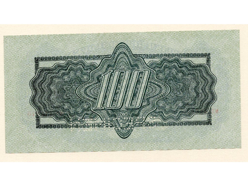Stokorunová poukázka byla jedním z klíčových nominálů této nouzové emise. Její provedení odráží důraz na ochranné prvky a ztíženou padělatelnost v době, kdy byla stabilita měny pro domácí trh zásadní. Tento kus je navíc vybaven perforací SPECIMEN umístěnou v horní části, což svědčí o jeho funkci jako neplatného vzorového exempláře určeného pro archivní, kontrolní či školící účely.