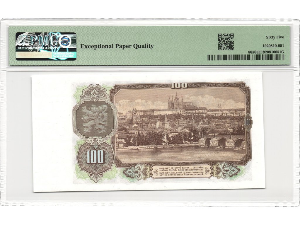 Tento exemplář je certifikován společností PMG s hodnocením 65 EPQ. Bankovka je ve výjimečném stavu – dokonale zachované barvy, ostré hrany a původní struktura papíru bez jakýchkoli úprav. Takto zachovalé exempláře představují vyhledávaný sběratelský materiál, zejména v této nejvyšší certifikované kvalitě.