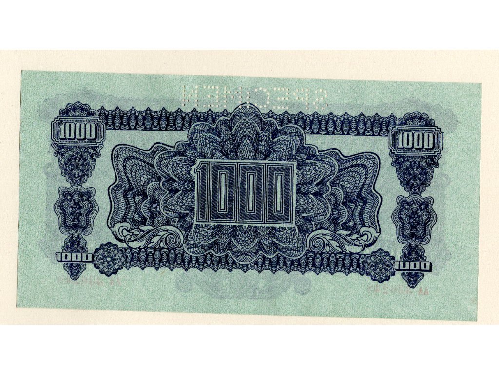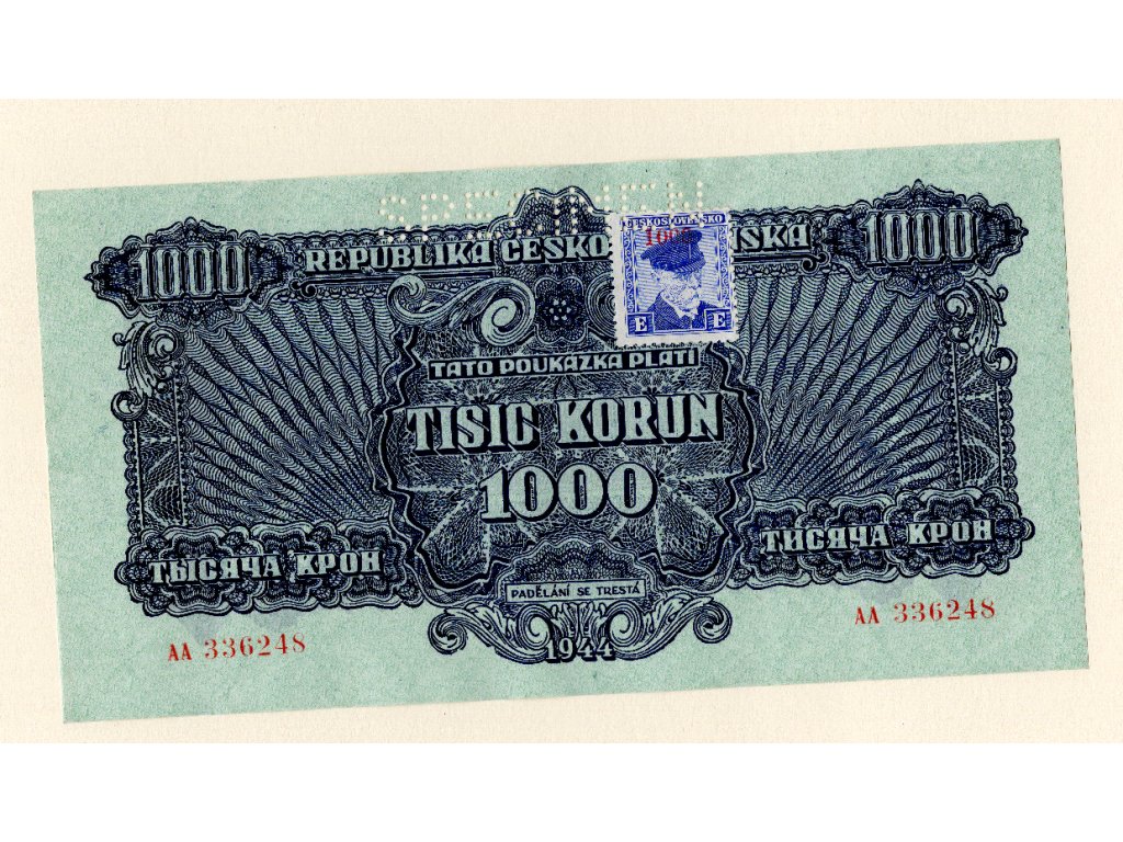 Československo – 1000 korun 1944, poukázka, série AA, SPECIMEN + kolek 1945