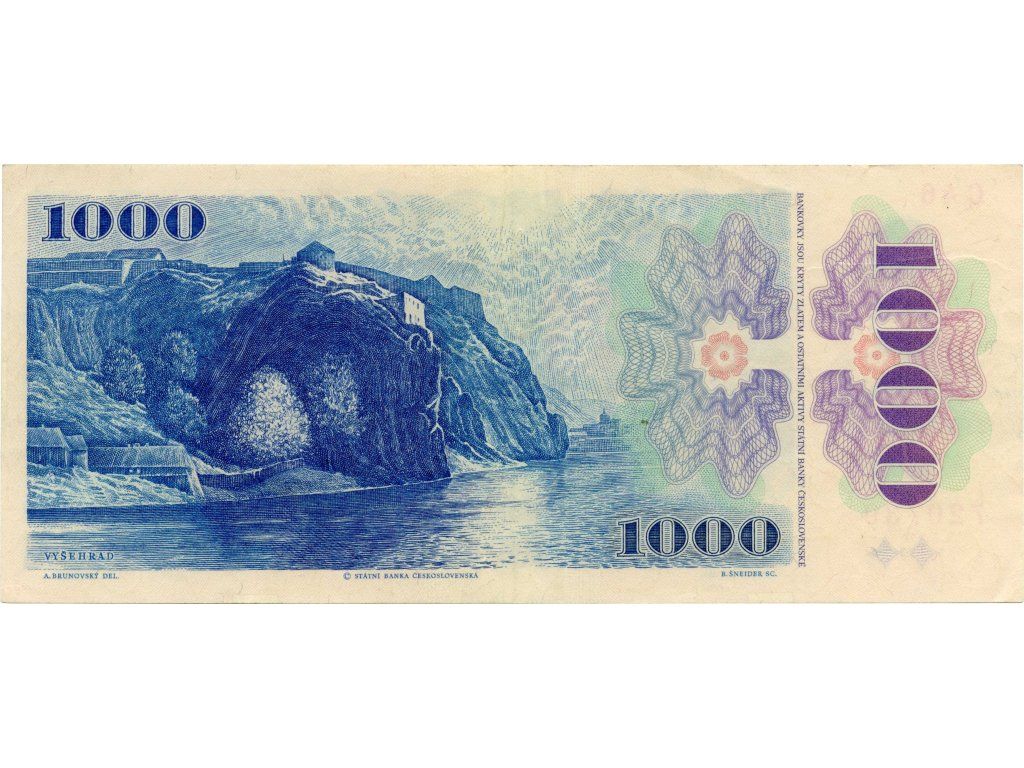 Reverzní motiv Vyšehradu odkazuje k Smetanově tvorbě i romantické představě českých dějin. Vyšehrad, pevnost spojená s legendami i Smetanovou symfonickou básní, se na bankovce objevuje jako esteticky silný prvek s hlubokým kulturním přesahem. Tato kombinace činí tisícikorunu jednou z nejhezčích československých oběhových bankovek.