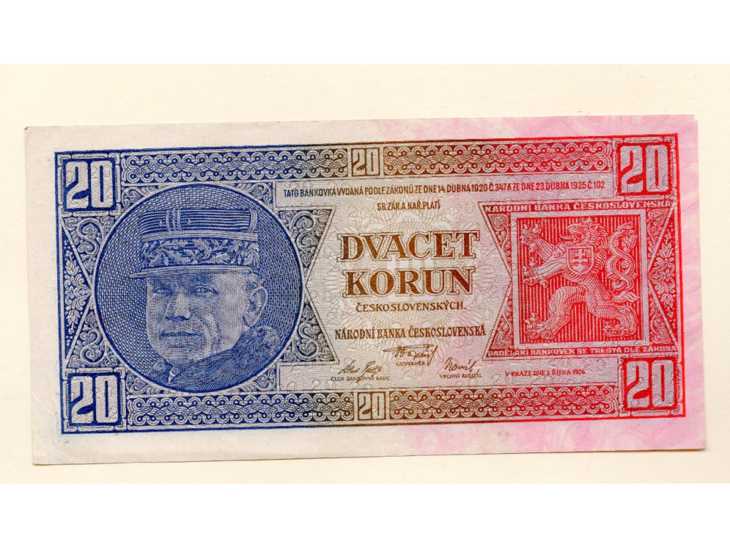 Tato dvacetikoruna je charakteristická pro precizní grafickou práci a výrazný národní motiv. První republika kladla na podobu bankovek mimořádný důraz – měly být nejen ochranným prvkem ekonomiky, ale také estetickým a kulturním symbolem státnosti. Právě díky tomu jsou dnes sběrateli velmi ceněny, neboť zachycují duch své doby autentickým způsobem.
