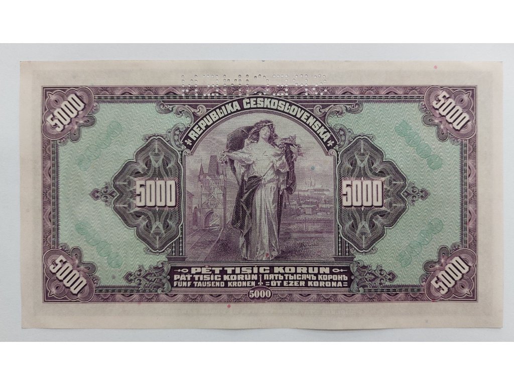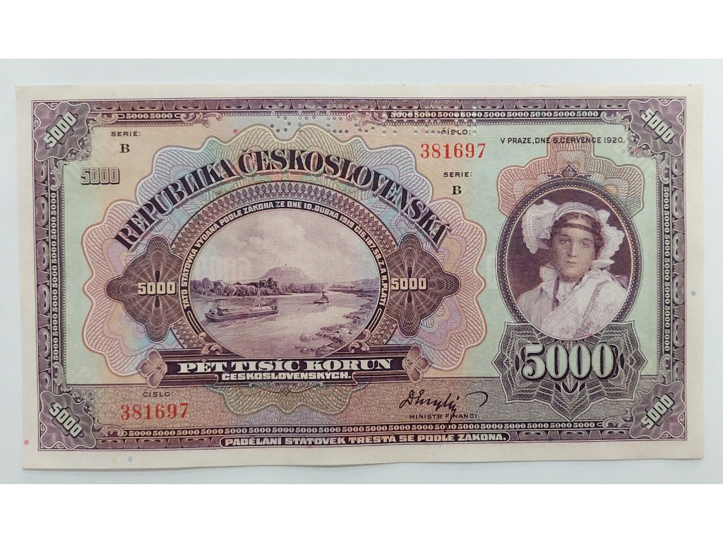 Pětitisícikoruna z roku 1920 patří mezi nejcennější a nejvzácnější bankovky první Československé republiky. Byla emitována krátce po vzniku samostatného státu a představovala symbol důvěry a ekonomické stability nově vzniklé republiky. Její tisk zajišťovala Státní tiskárna cenin v Praze, a výtvarné zpracování navazuje na estetické tradice secesního období s výrazným realistickým pojetím.