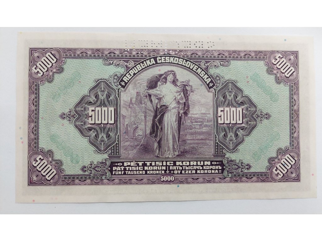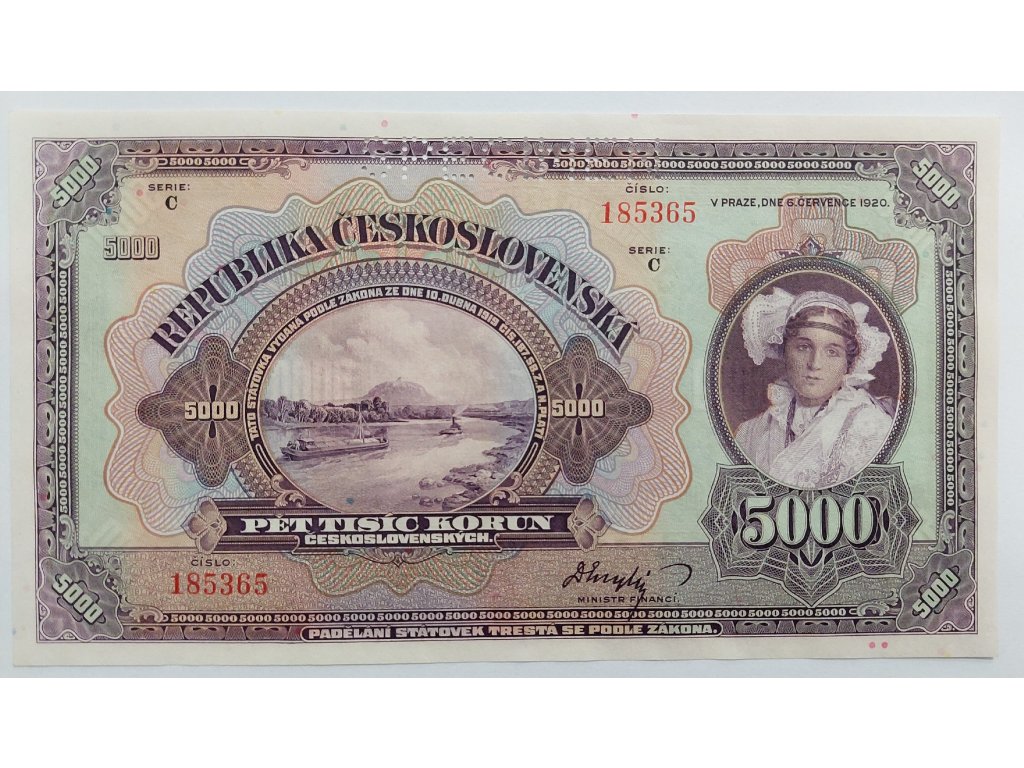 Pětitisícikoruna z roku 1920 patří mezi nejcennější a nejvzácnější bankovky první Československé republiky. Byla emitována krátce po vzniku samostatného státu a představovala symbol důvěry a ekonomické stability nově vzniklé republiky. Její tisk zajišťovala Státní tiskárna cenin v Praze, a výtvarné zpracování navazuje na estetické tradice secesního období s výrazným realistickým pojetím.