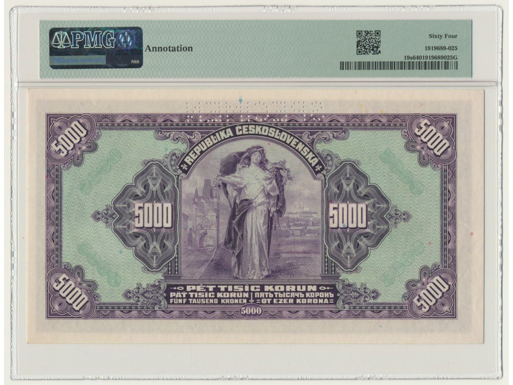 Pětitisícikoruna z roku 1920 tak představuje významný doklad počátků československé měny a zároveň mimořádně reprezentativní ukázku bankovního umění první republiky.