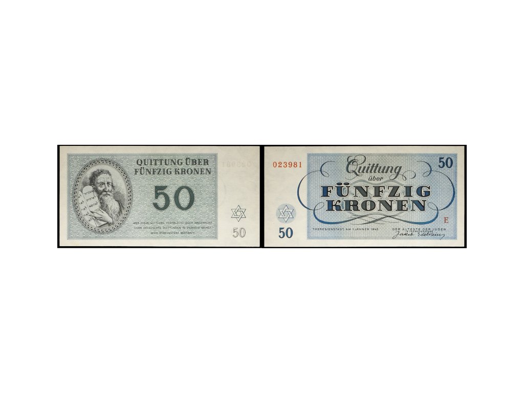 Poukázky v nominální hodnotě 50 korun z roku 1943 neměly charakter skutečné měny a nebyly kryty žádnou reálnou hodnotou. Jejich účelem bylo oddělit vězně od skutečných peněz a vytvořit zdání samosprávy, které bylo zneužíváno především pro propagandistické účely nacistického režimu.