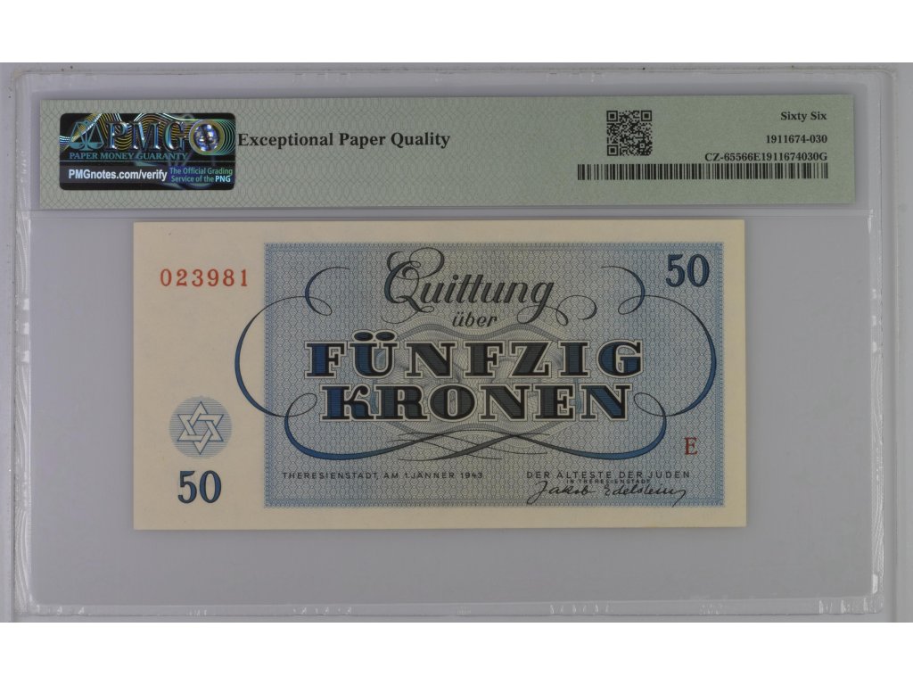 Československo – Terezín – 50 korun 1943, poukázka PMG 66 EPQ GEM UNC