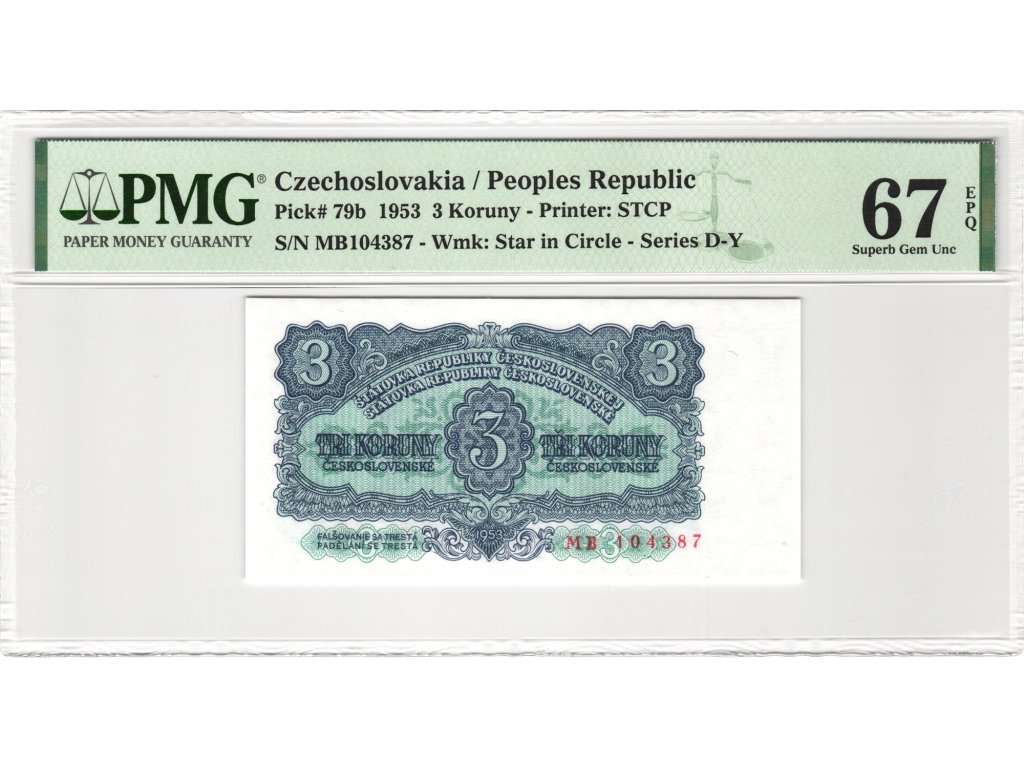 Československo 3 Koruna 1953 S. MB PMG 67 EPQ