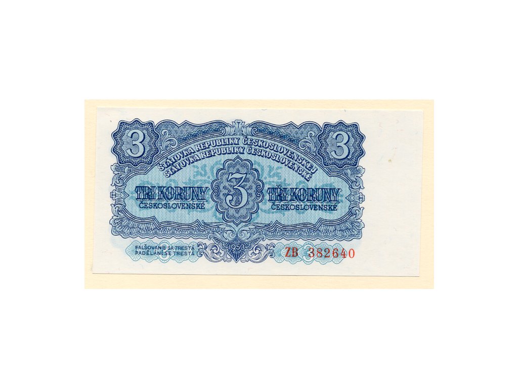 Tříkorunová bankovka z roku 1953 je jedním z nejikoničtějších papírových platidel rané fáze socialistického Československa. Přední stranu zdobí bohatě orámovaný nominál s nápisem *TŘI KORUNY ČESKOSLOVENSKÉ*, zatímco rubová strana je věnována státnímu znaku a ideovému poselství o krytí měny veřejným majetkem republiky.