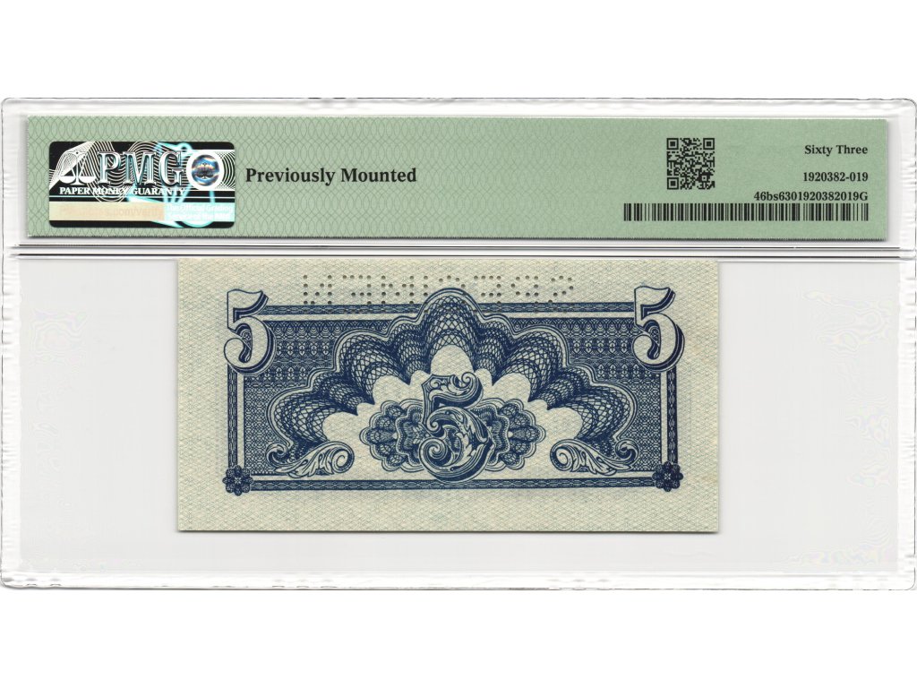 Předkládaný kus je označen jako SPECIMEN, tedy ukázkový výtisk určený pro evidenční a prezentační účely. Certifikace PMG 63 Choice Uncirculated potvrzuje neoběhový stav s velmi kvalitním zachováním papíru i tisku. Poznámka „Previously Mounted“ upozorňuje na dřívější uložení, které však nemá zásadní vliv na celkovou atraktivitu exempláře.