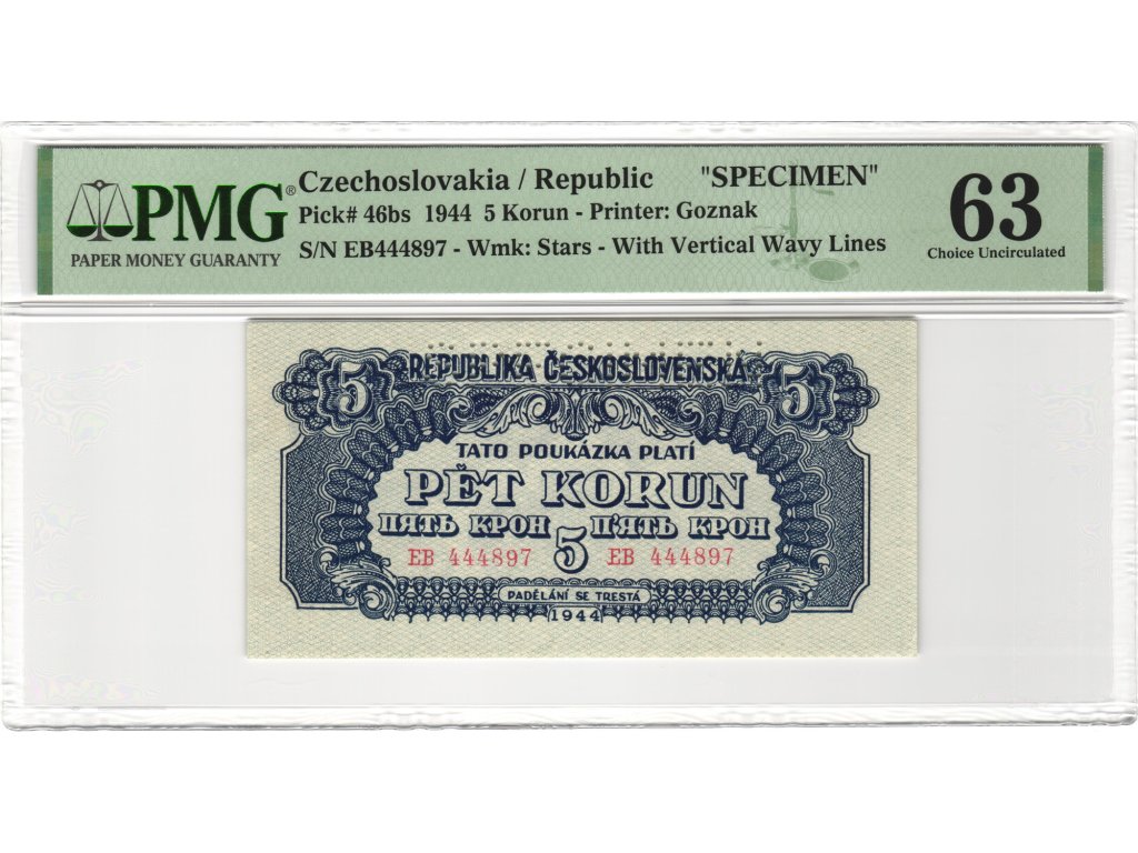 Československo 5 korun 1944 S. EB PMG 63 Specimen