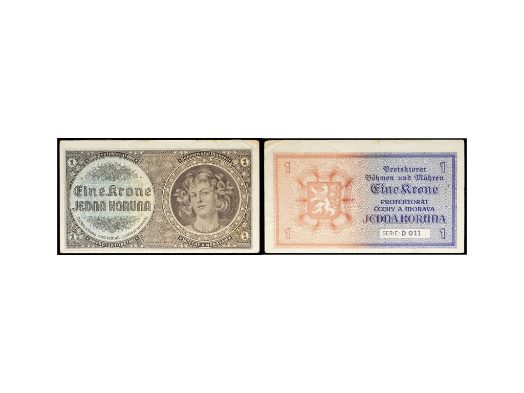 Bankovka o hodnotě 1 koruna představovala základní nominál určený pro každodenní drobné platby. Byla vydána v dubnu 1940 a rychle se stala běžnou součástí peněžního oběhu. Dvojjazyčné nápisy v češtině a němčině vyjadřují oficiální status protektorátu a jeho podřízenost německé správě.