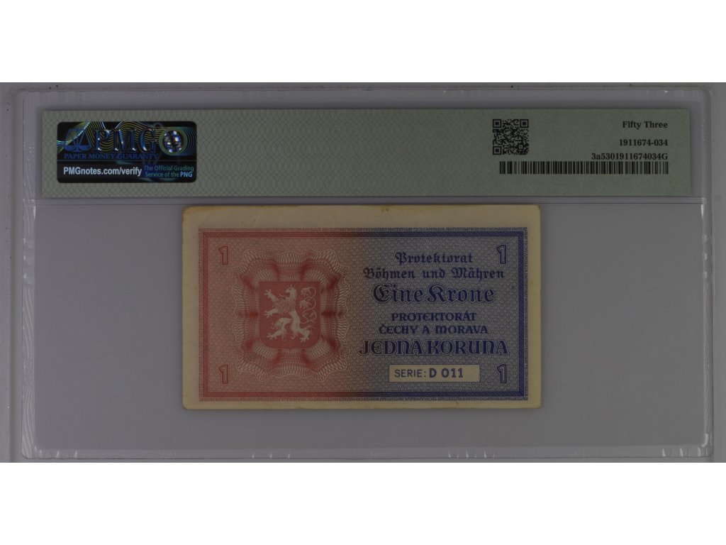Hodnocení PMG 53 About Uncirculated potvrzuje velmi pěkný stav zachování s pouze minimálními stopami manipulace. Certifikace renomované společnosti PMG zaručuje pravost a odborně stanovený stupeň kvality, což je pro sběratele bankovek období let 1939–1945 zásadní faktor.