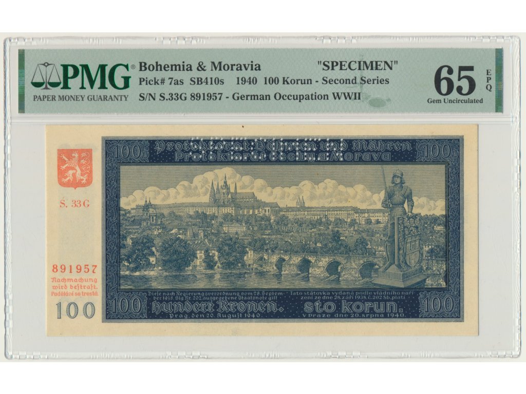 Protektorát Čechy a Morava – 100 korun 1940, druhá série, Specimen, PMG 65 EPQ