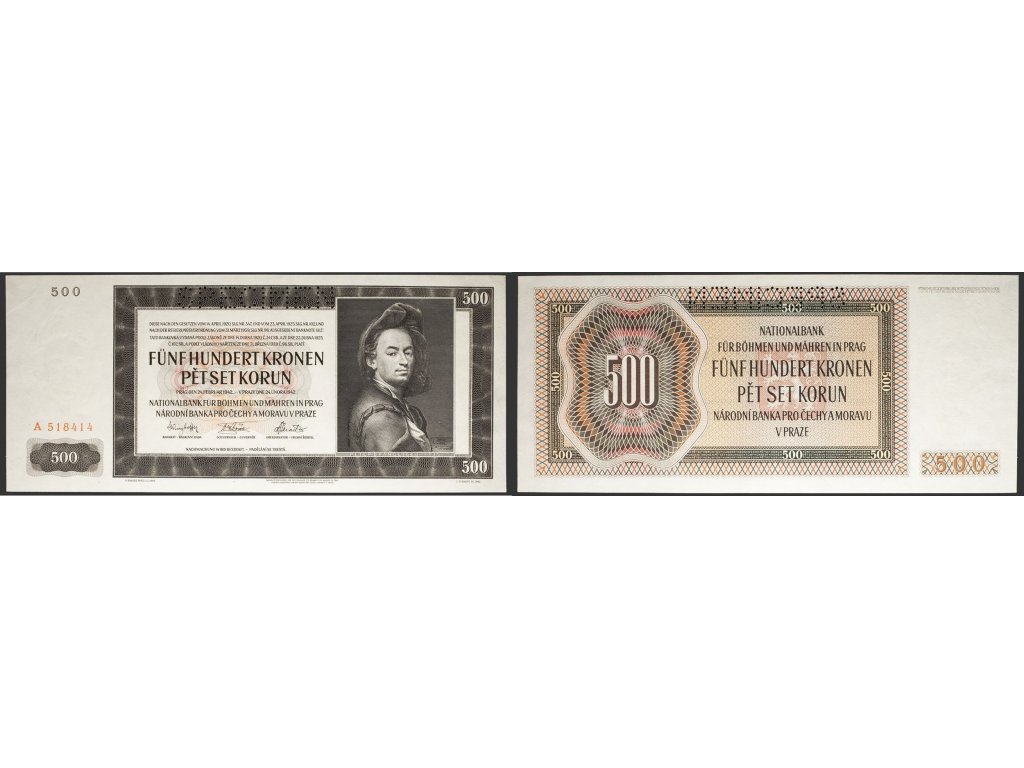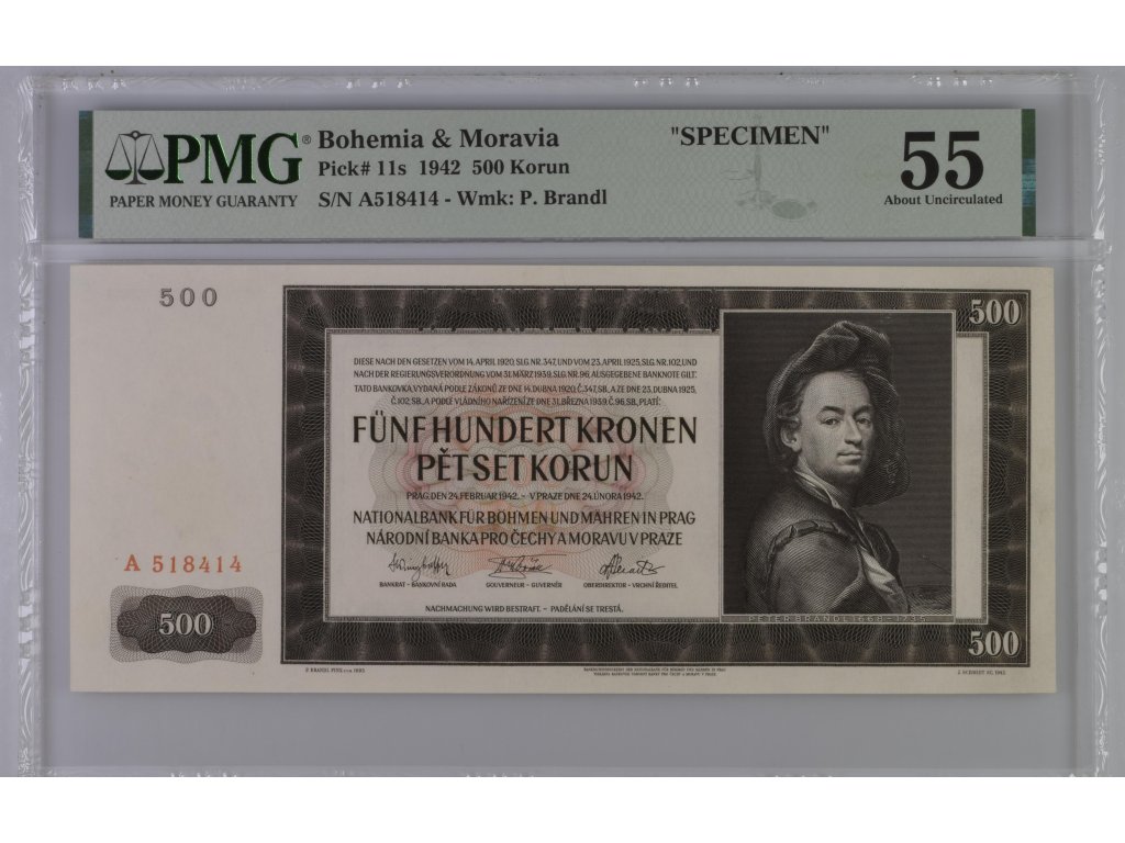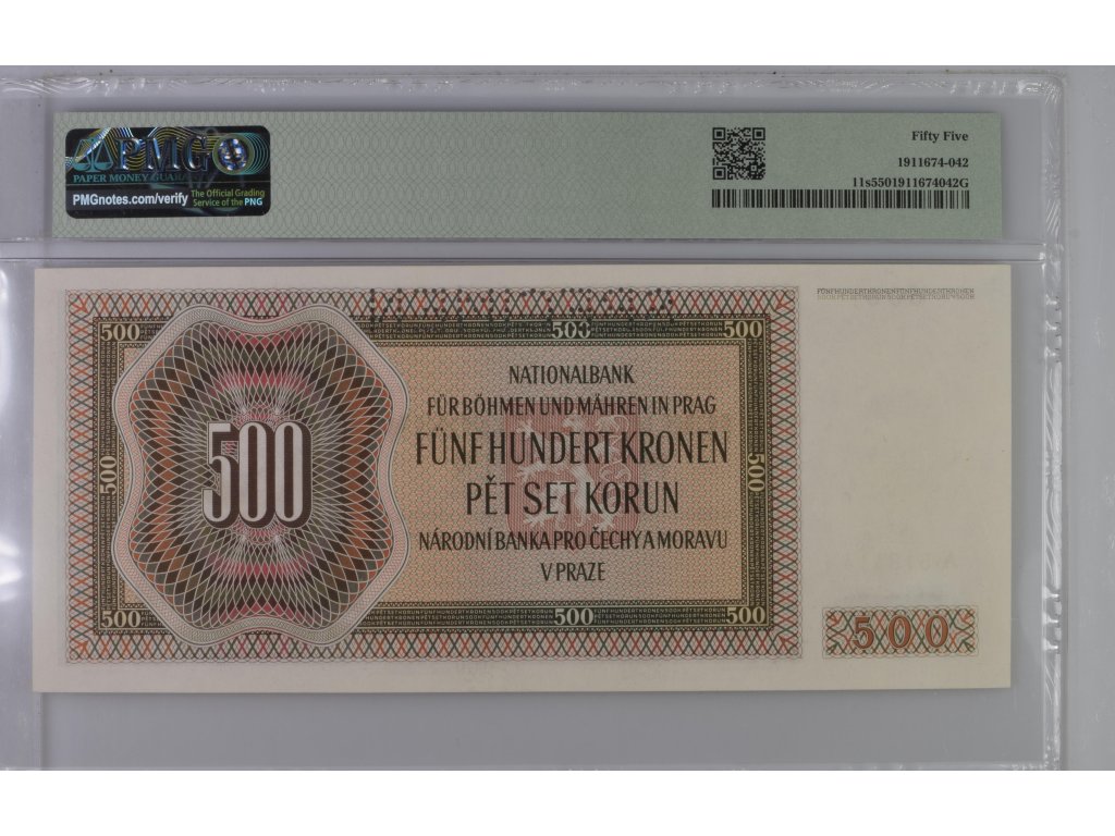 Protektorát Čechy a Morava 500 Korun 1942 S. A 1. emise Specimen PMG 55