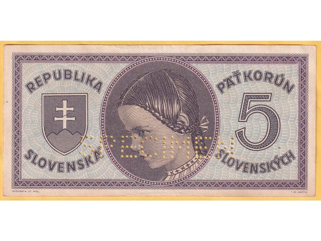 Slovensko v letech 1939–1945 fungovalo jako samostatný stát vzniklý v důsledku válečných událostí a rozpadu Československa. Jeho peněžní systém se rychle vyvíjel a byl výrazně ovlivněn politickými okolnostmi i ekonomickými omezeními konce války. Pětikorunová státovka bez uvedeného data, vydaná v roce 1945, je jedním z posledních platidel této republiky a zachycuje období těsně před jejím zánikem.