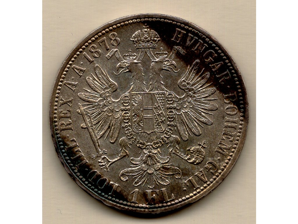 Tento stříbrný zlatník (1 florin) z roku 1878 byl ražen bez značky mincovny (b.zn.) během vlády císaře Františka Josefa I., v období tzv. spolkové měny, kdy byl florin (gulden) hlavní měnovou jednotkou habsburské monarchie. Averz nese portrét panovníka s vavřínovým věncem a legendou FRANC IOS I D G AVSTRIAE IMPERATOR, zatímco reverz zobrazuje korunovaného dvouhlavého orla s erbem a textem označujícím císařské tituly, rok ražby a nominální hodnotu 1 FL.